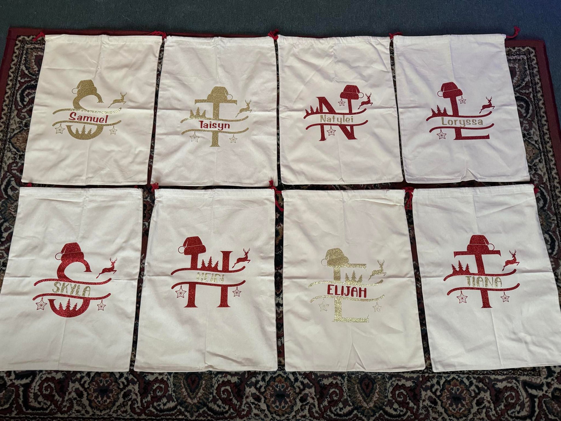 Large Santa sack - approx 40cm x 60cm. Design will be done in gold glitter, with your choice of glitter coloured name. Please enter name in the text box.