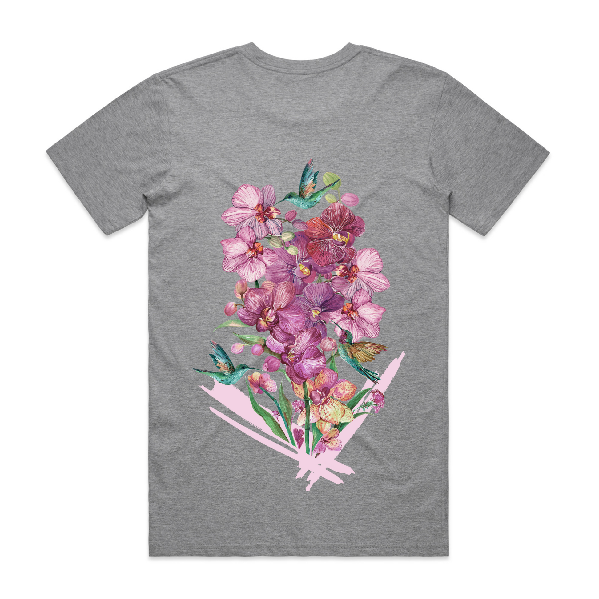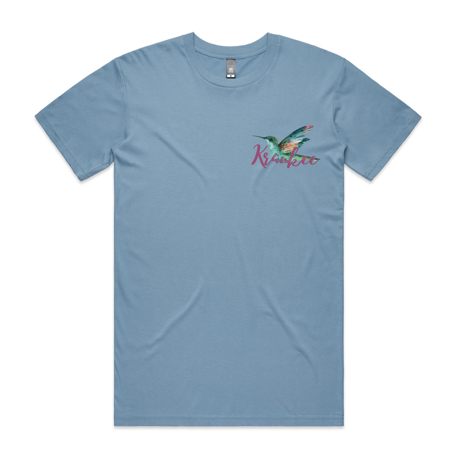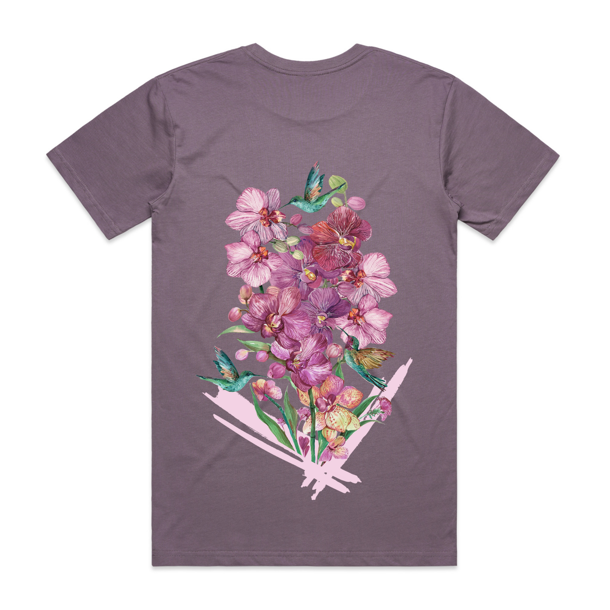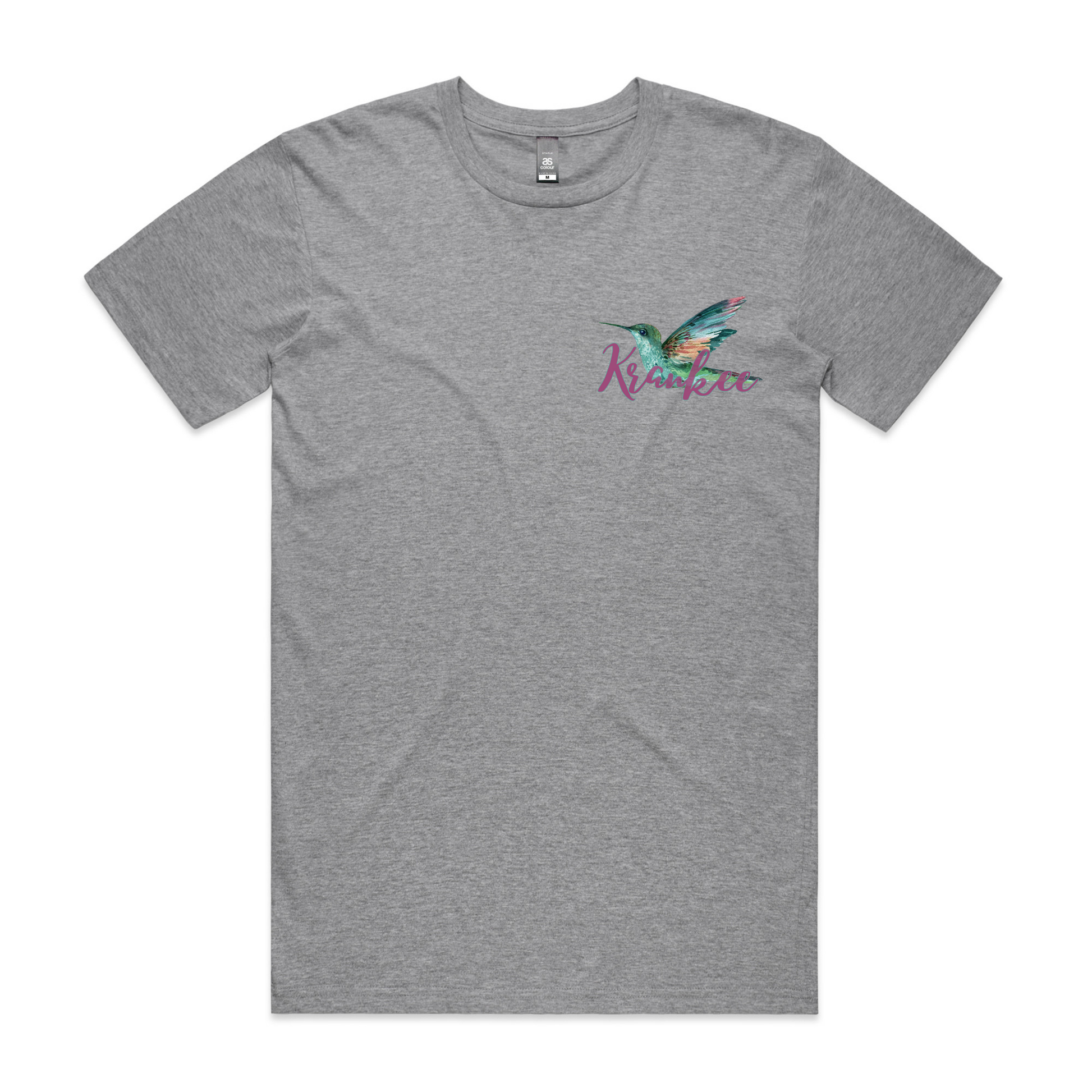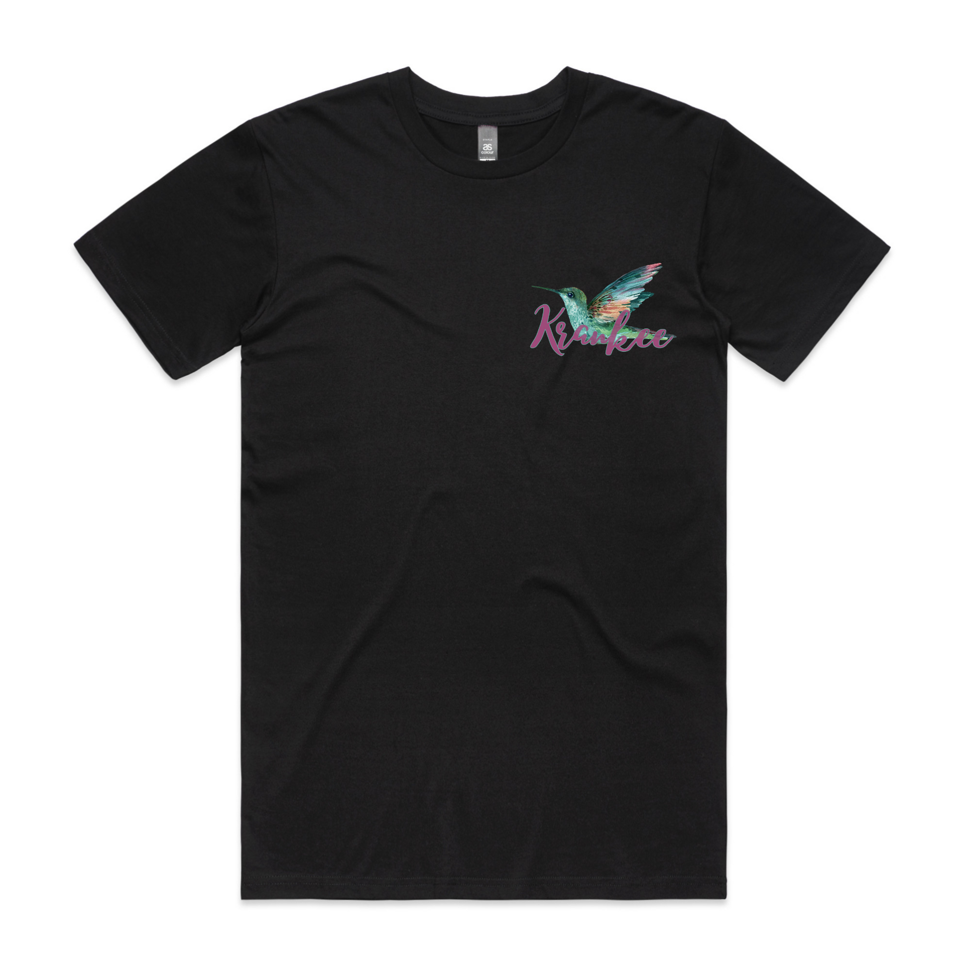 Large, vibrant, floral orchid & hummingbird design on the back with a small hummingbird & "Krankee" on the front chest.