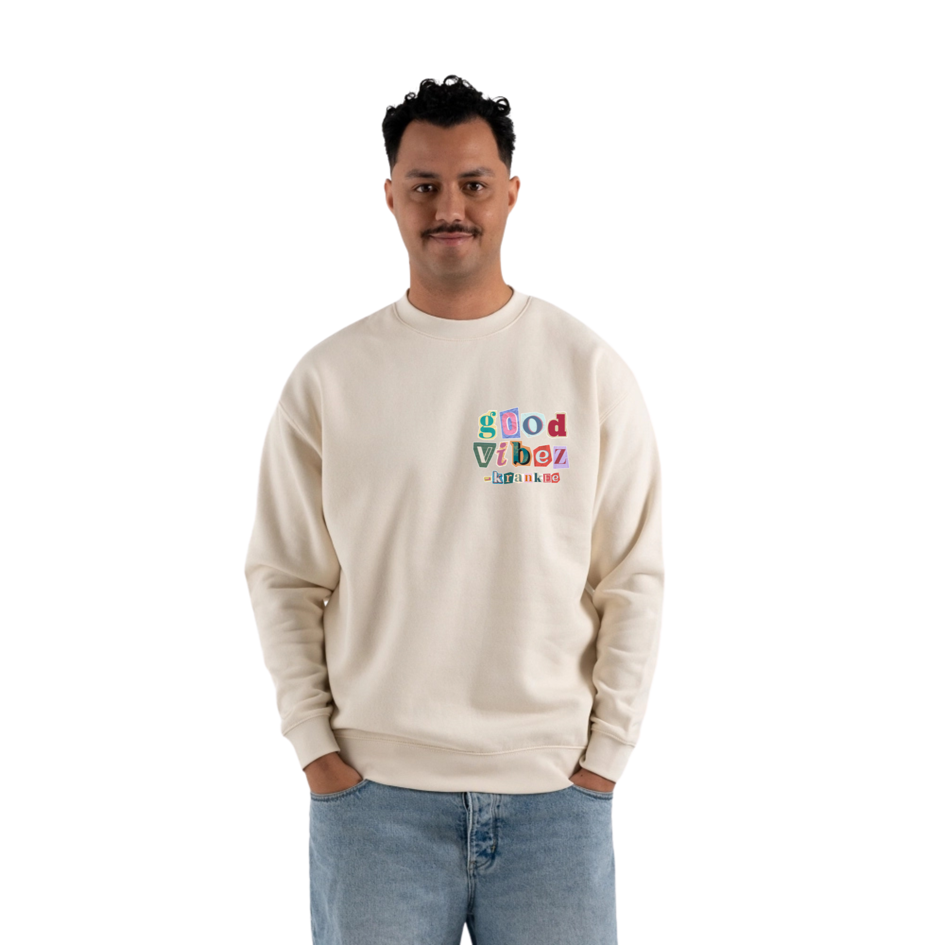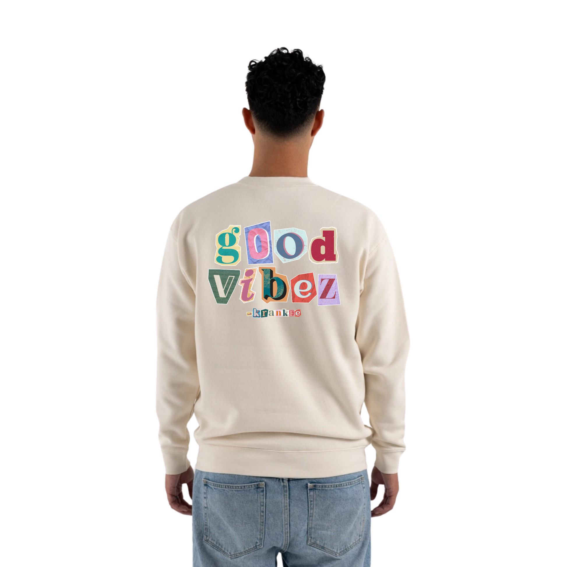 Large Krankee good vibez design on the back, mini chest one on the front.