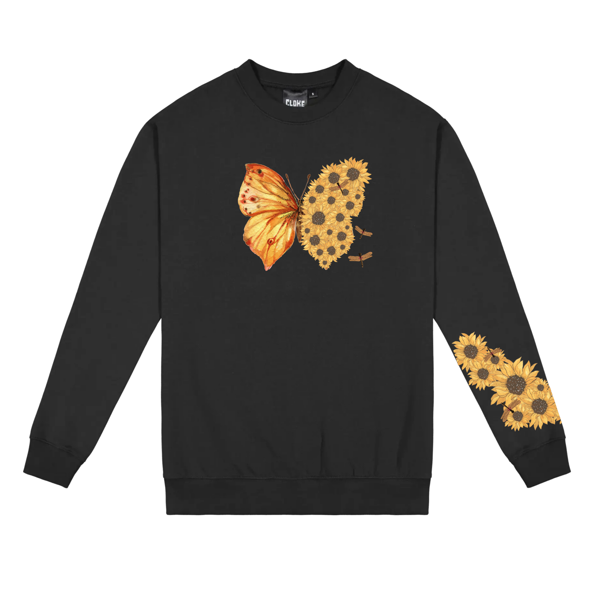 Butterfly/sunflower design on the front, with a matching sleeve design.