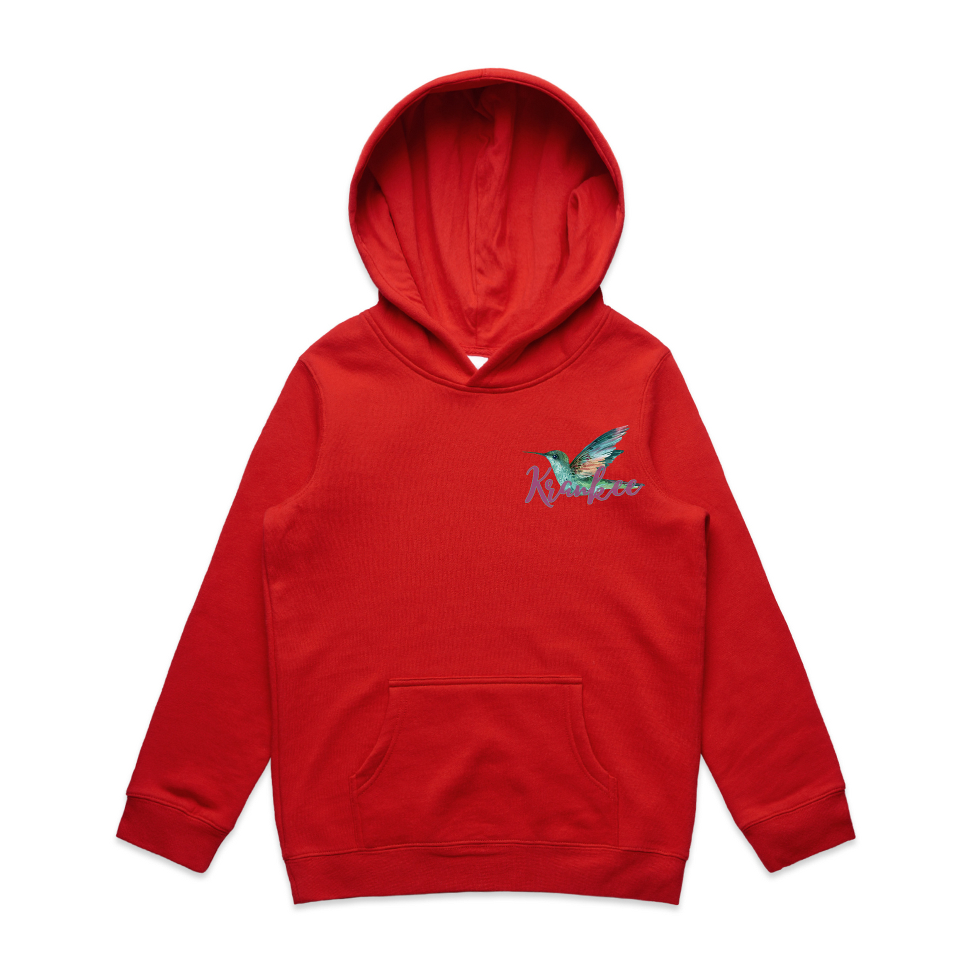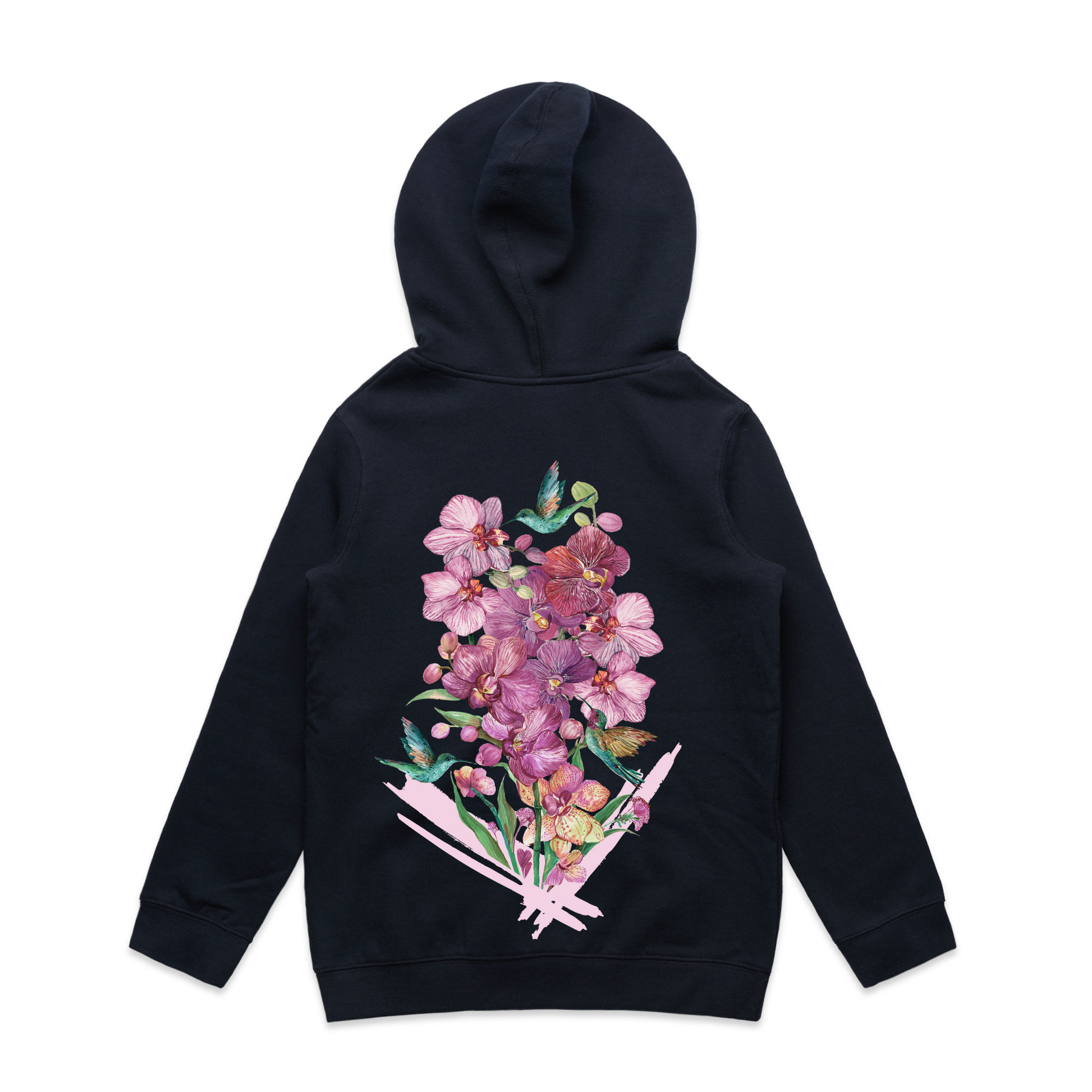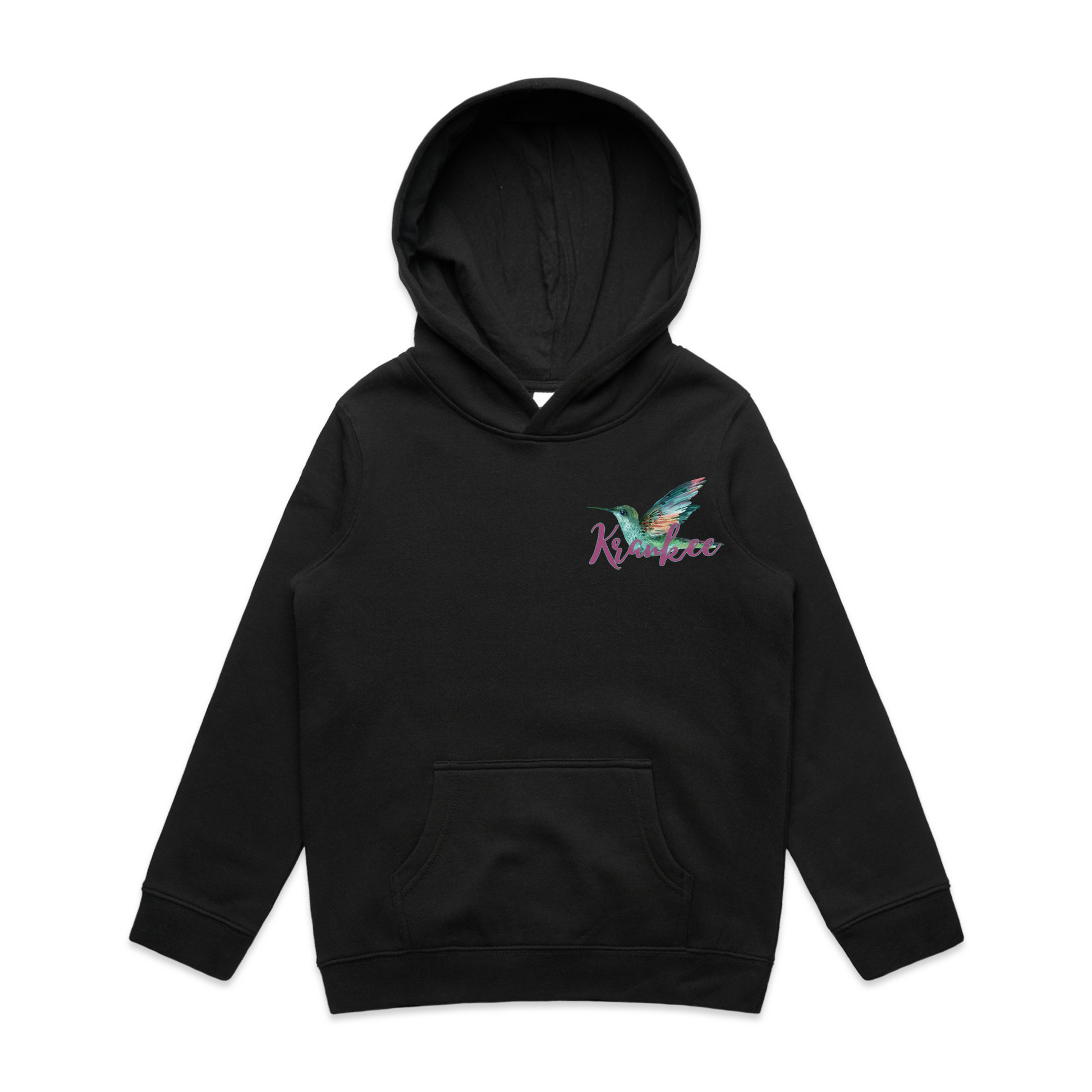 Large, vibrant, floral orchid & hummingbird design on the back with a small hummingbird & "Krankee" on the front chest.