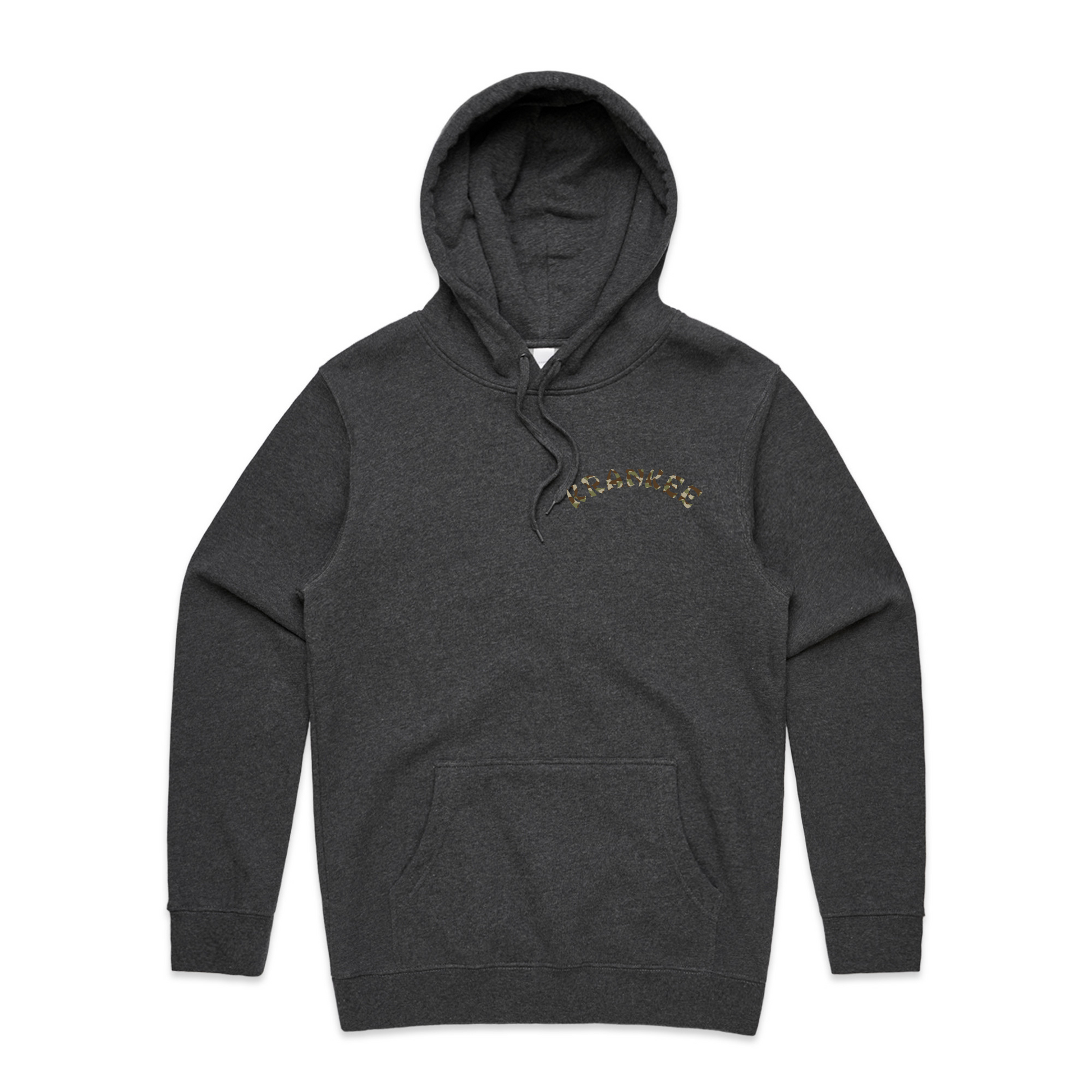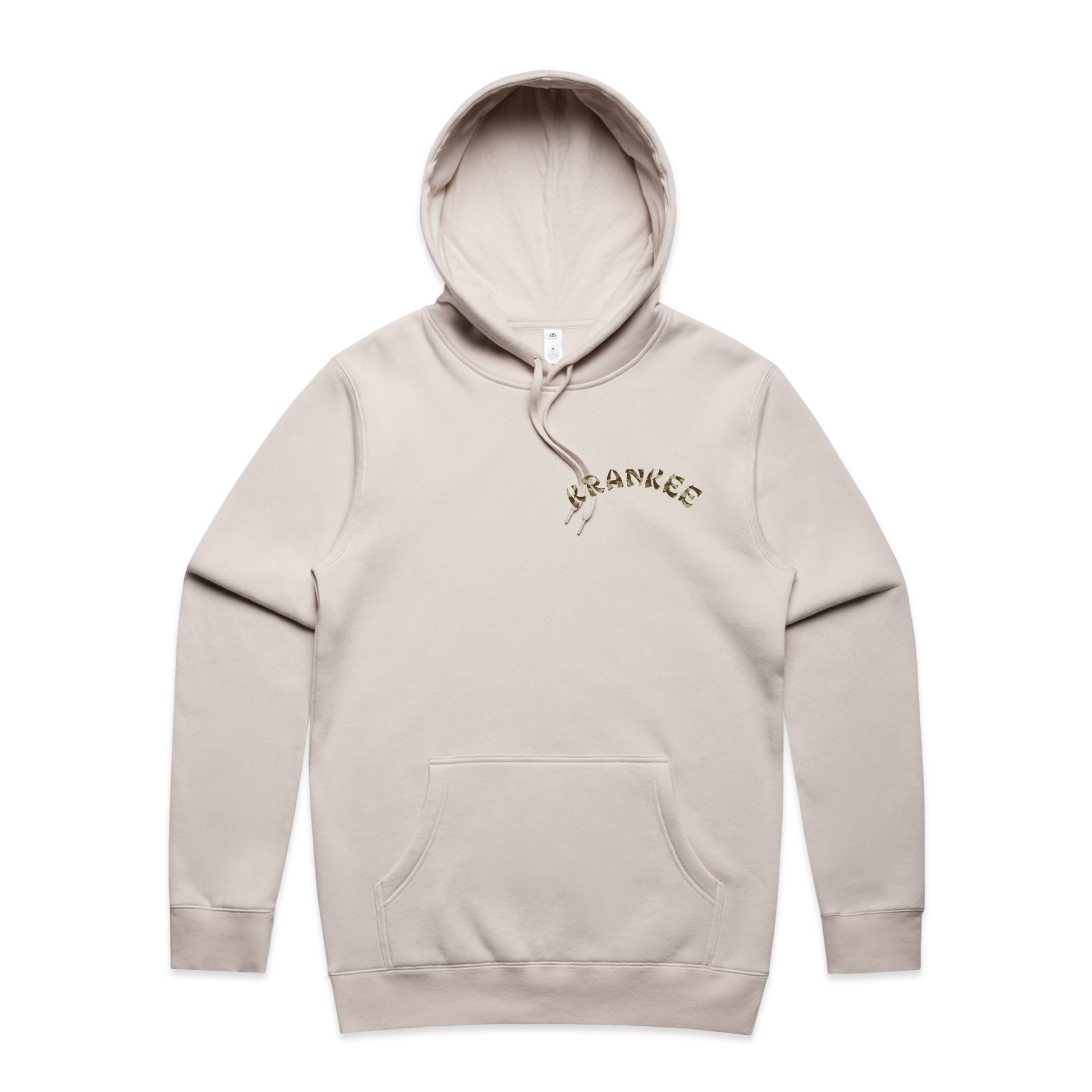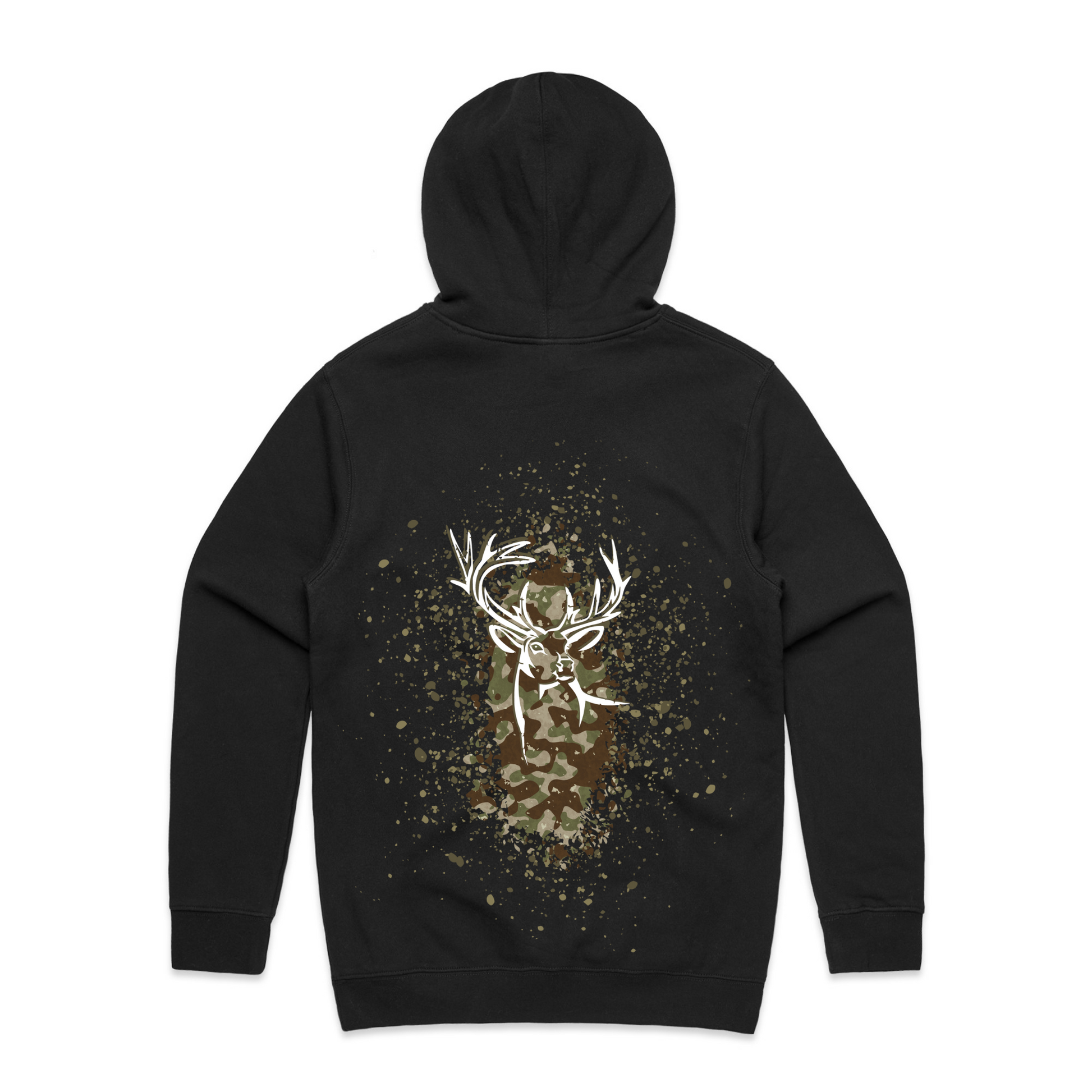 Large camo stag design on the back, with a small camo font "Krankee" on the front