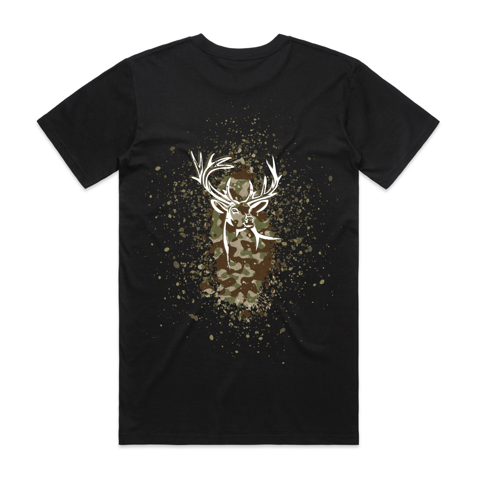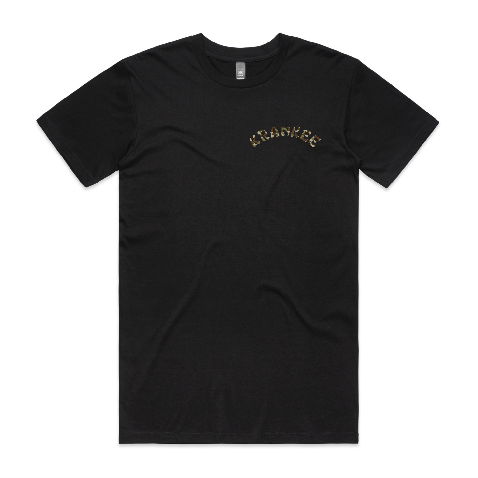 Large camo stag design on the back, with a small camo font "Krankee" on the front