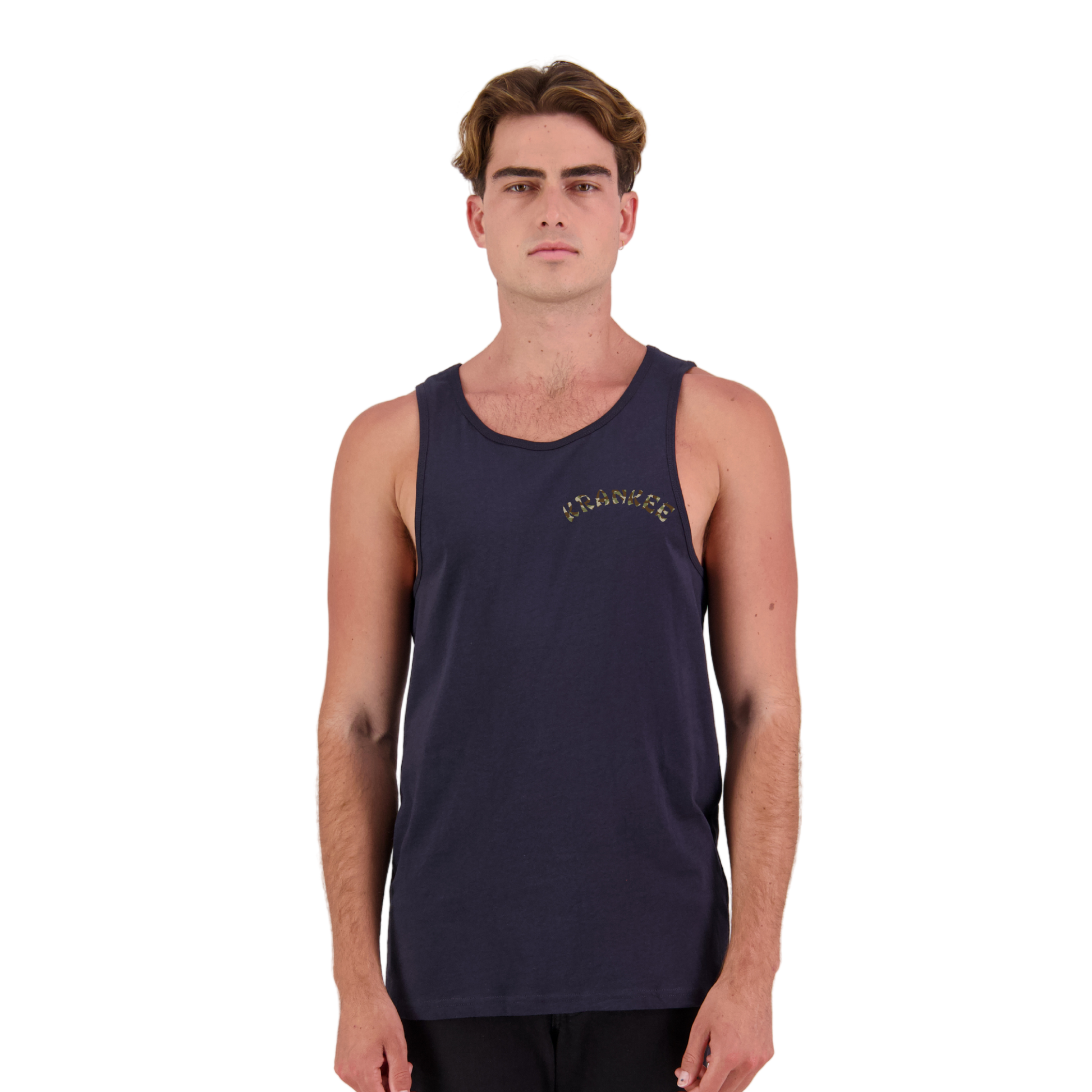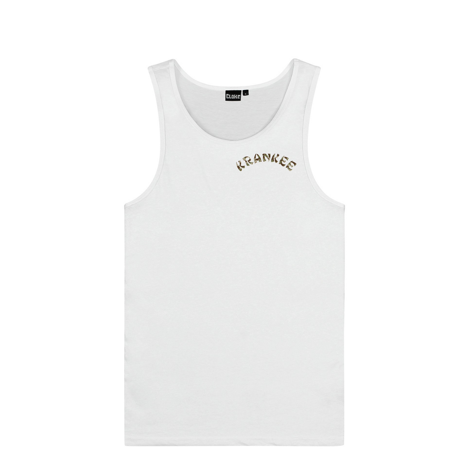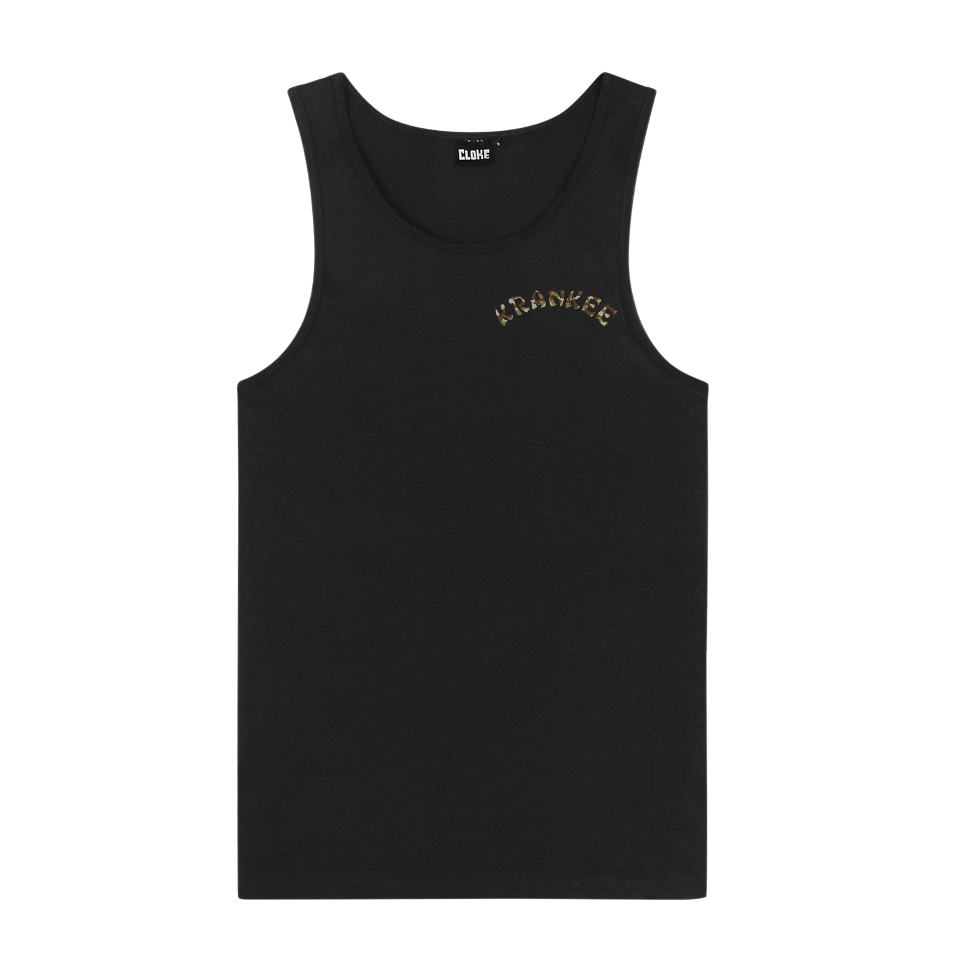 Large camo stag design on the back, with a small camo font "Krankee" on the front