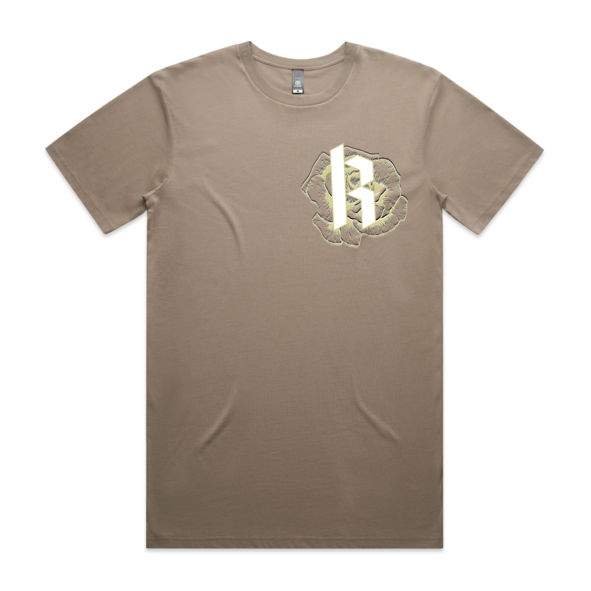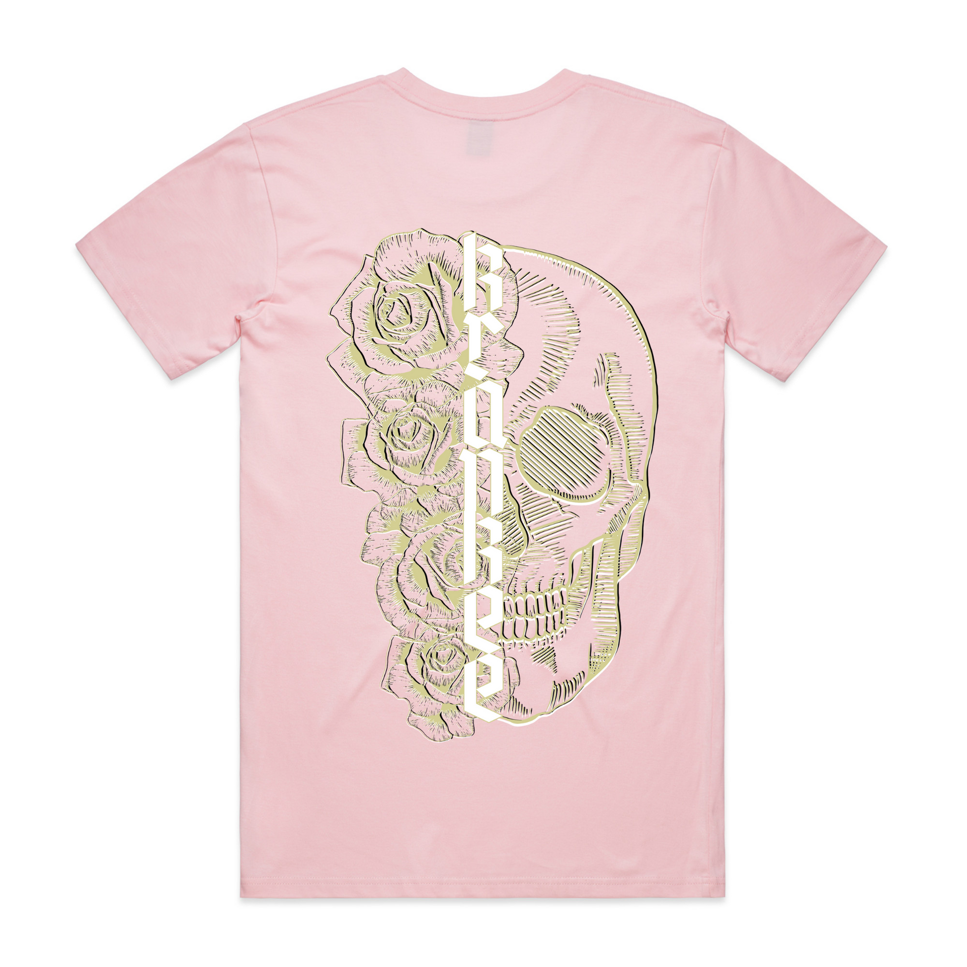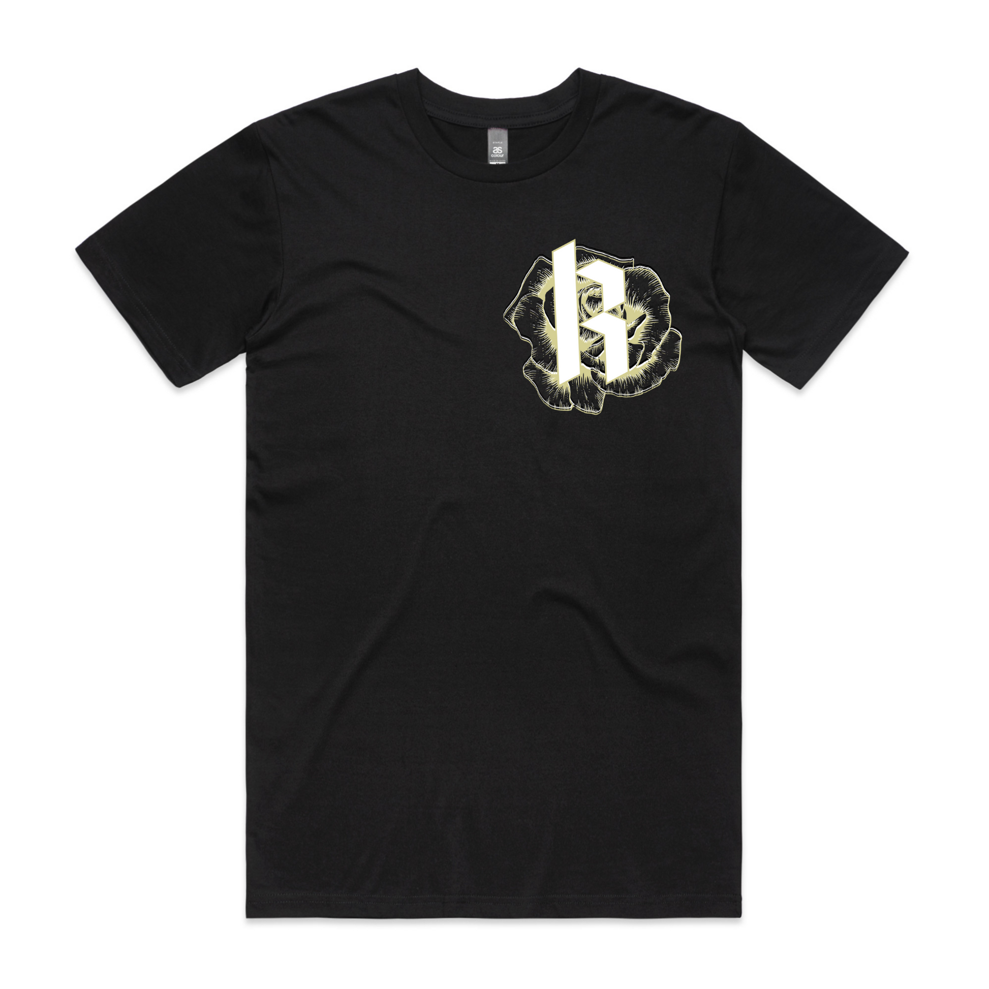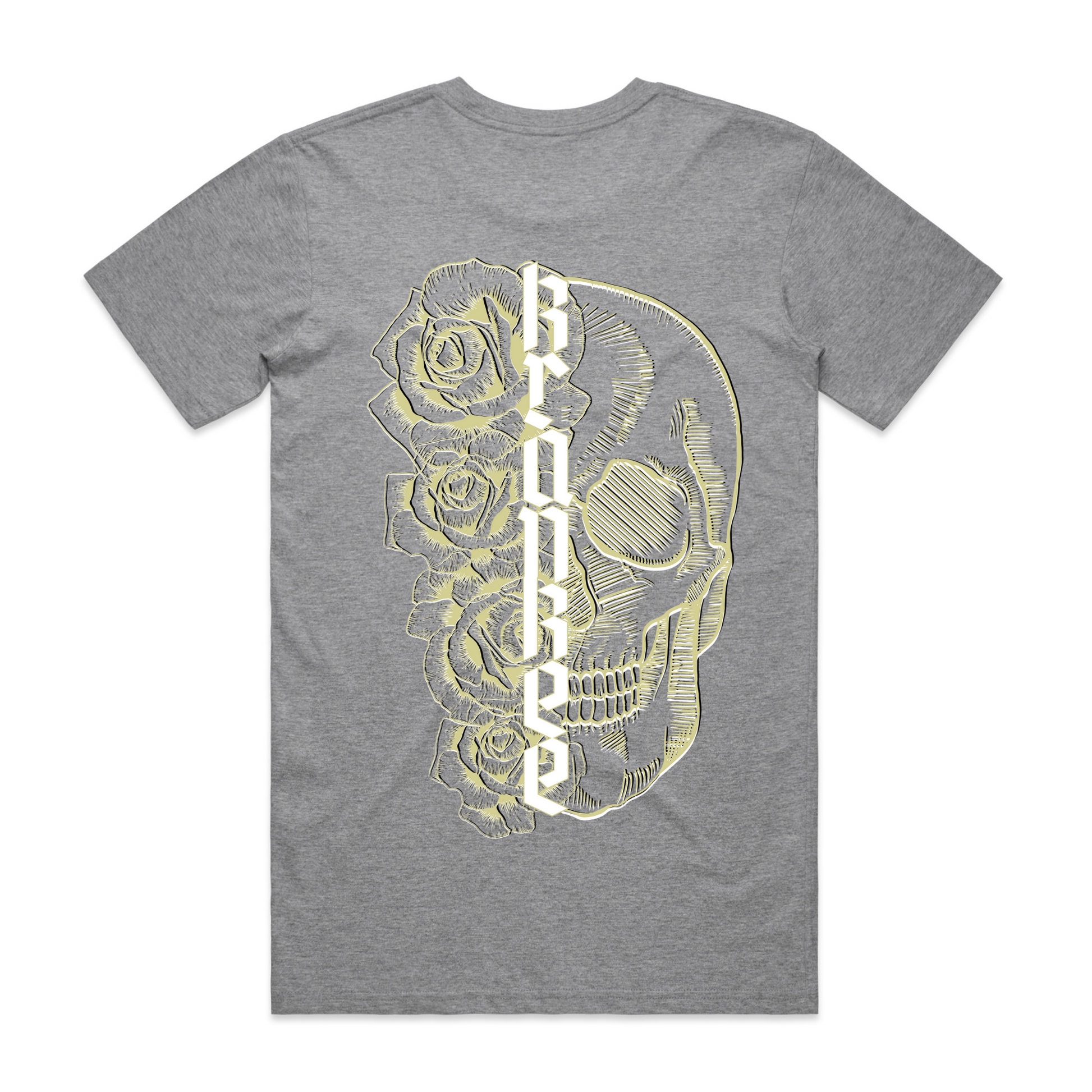 Large metallic rose/skull back piece. Small Metallic K/Rose logo design on the front - the gold being metallic.