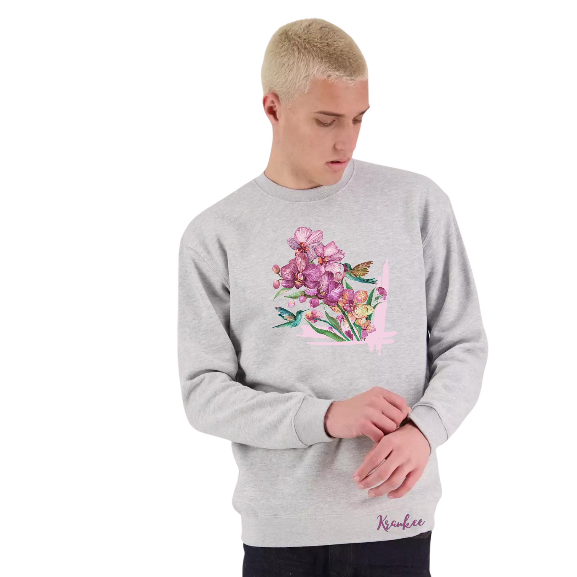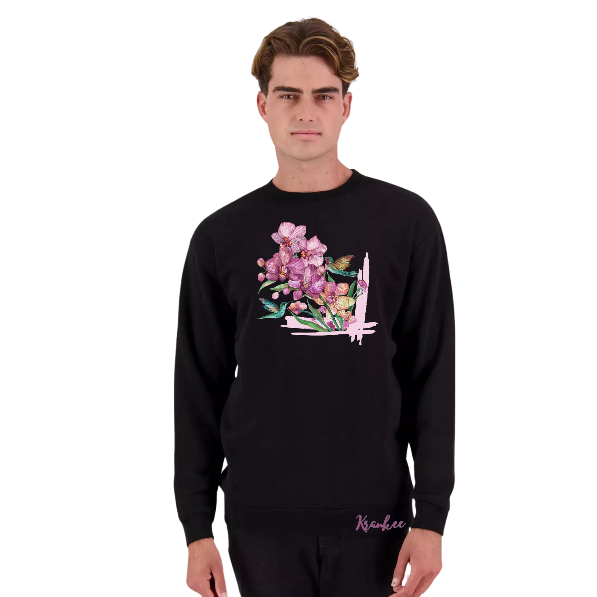 Vibrant, floral orchid & hummingbird design on the front with nothing on the back.