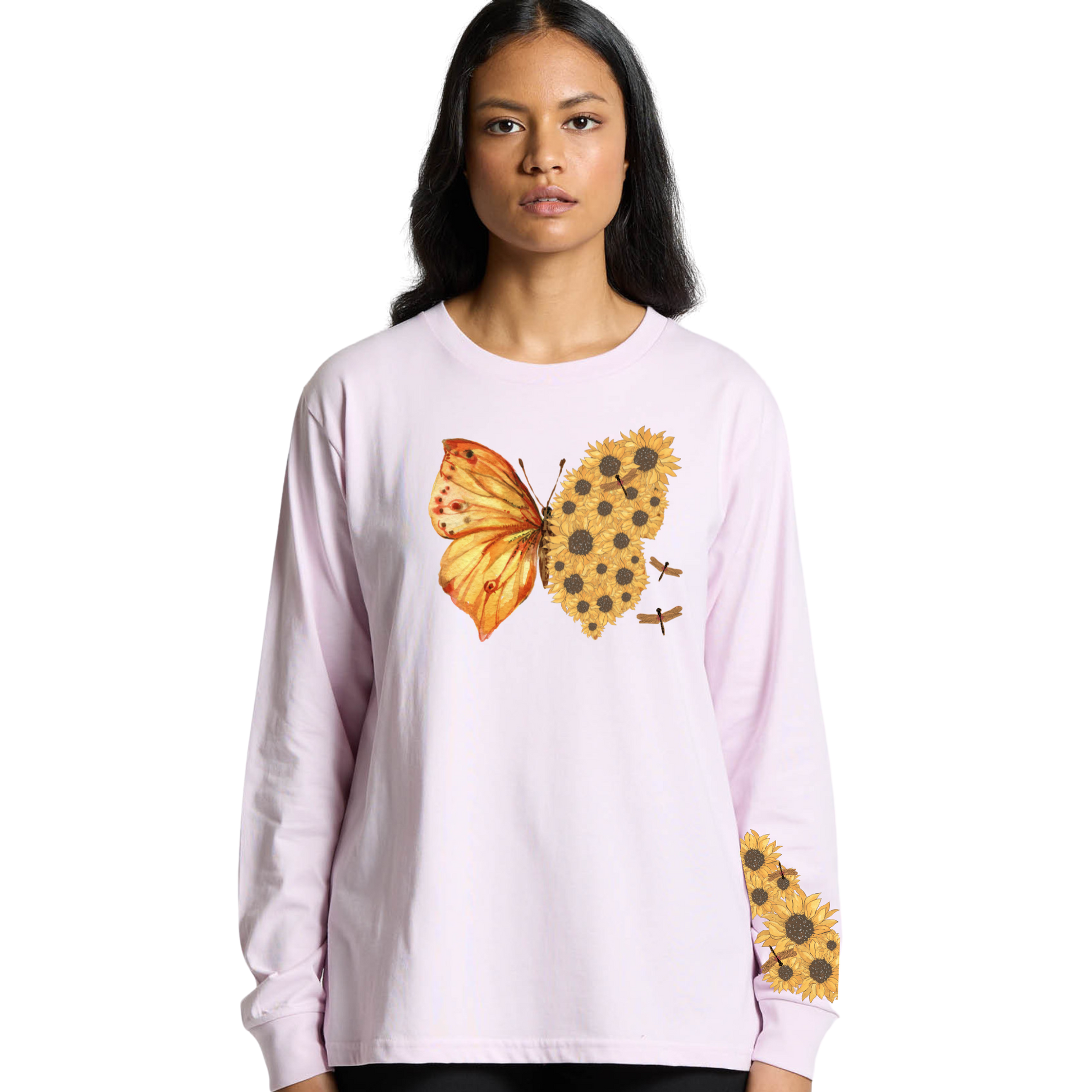 Butterfly sunflower design on the front, with a matching sleeve design.