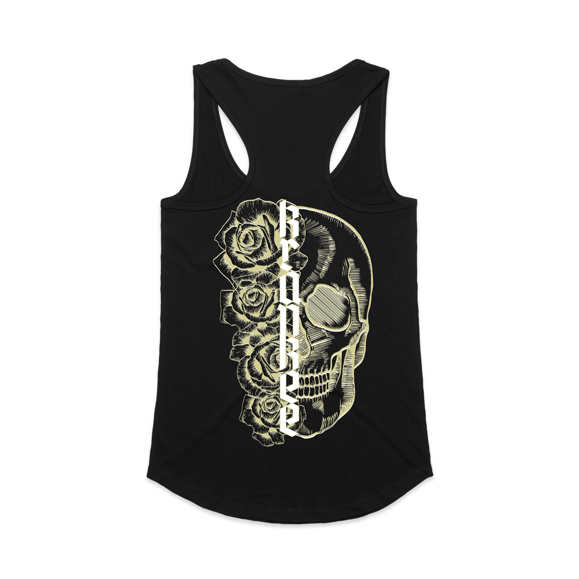 Large metallic rose/skull back piece. Small Metallic K/Rose logo design on the front - the gold pink being metallic.