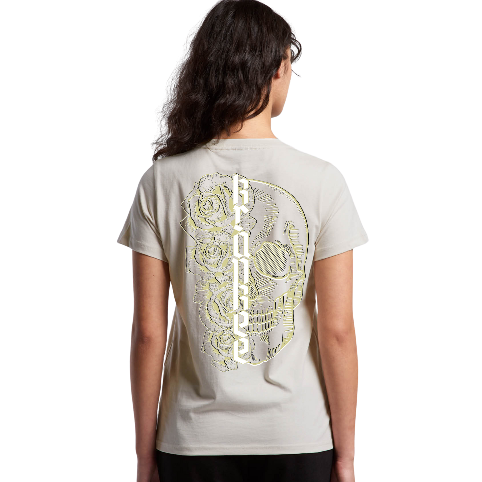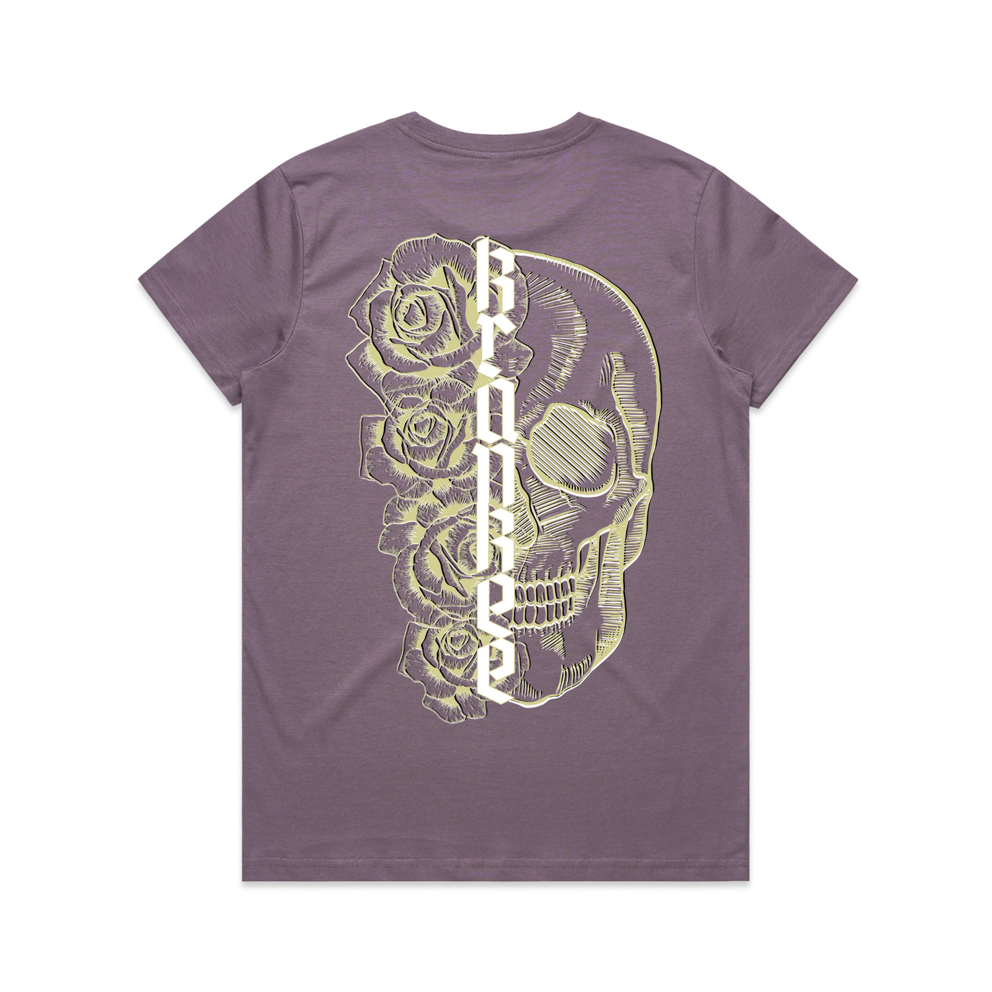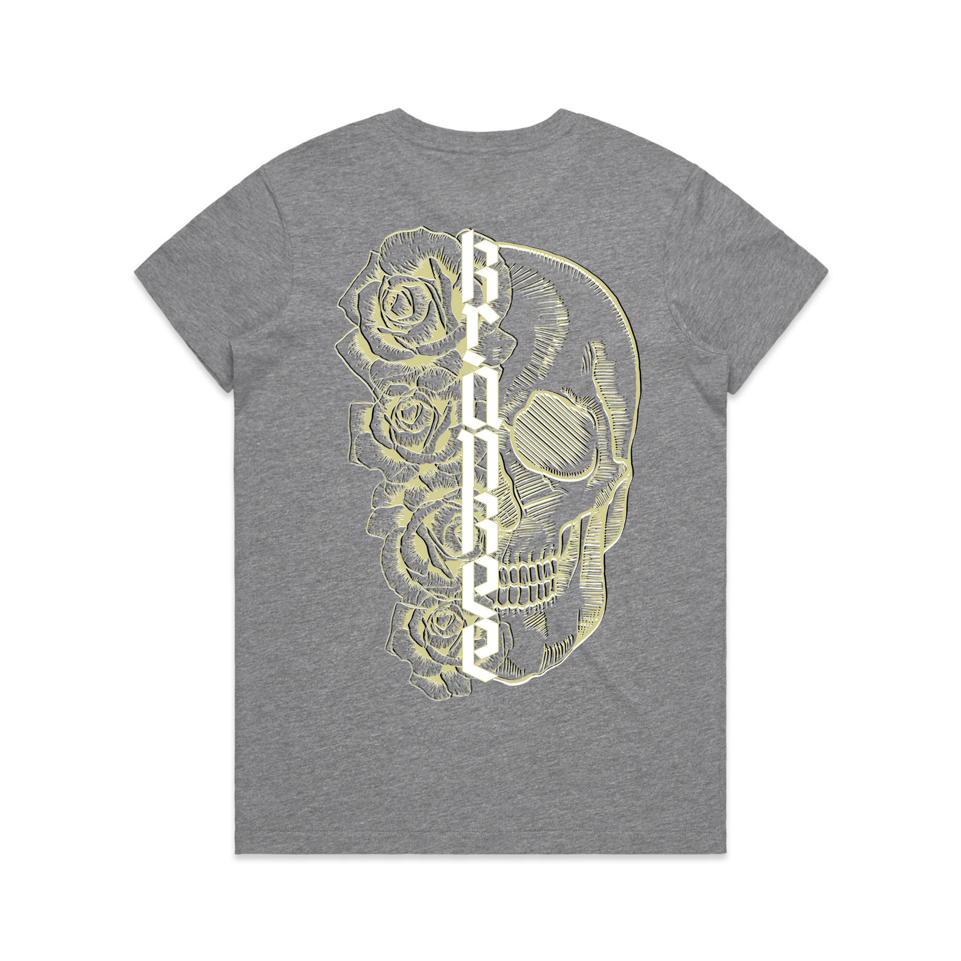 Large metallic rose/skull back piece. Small Metallic K/Rose logo design on the front - the gold being metallic.