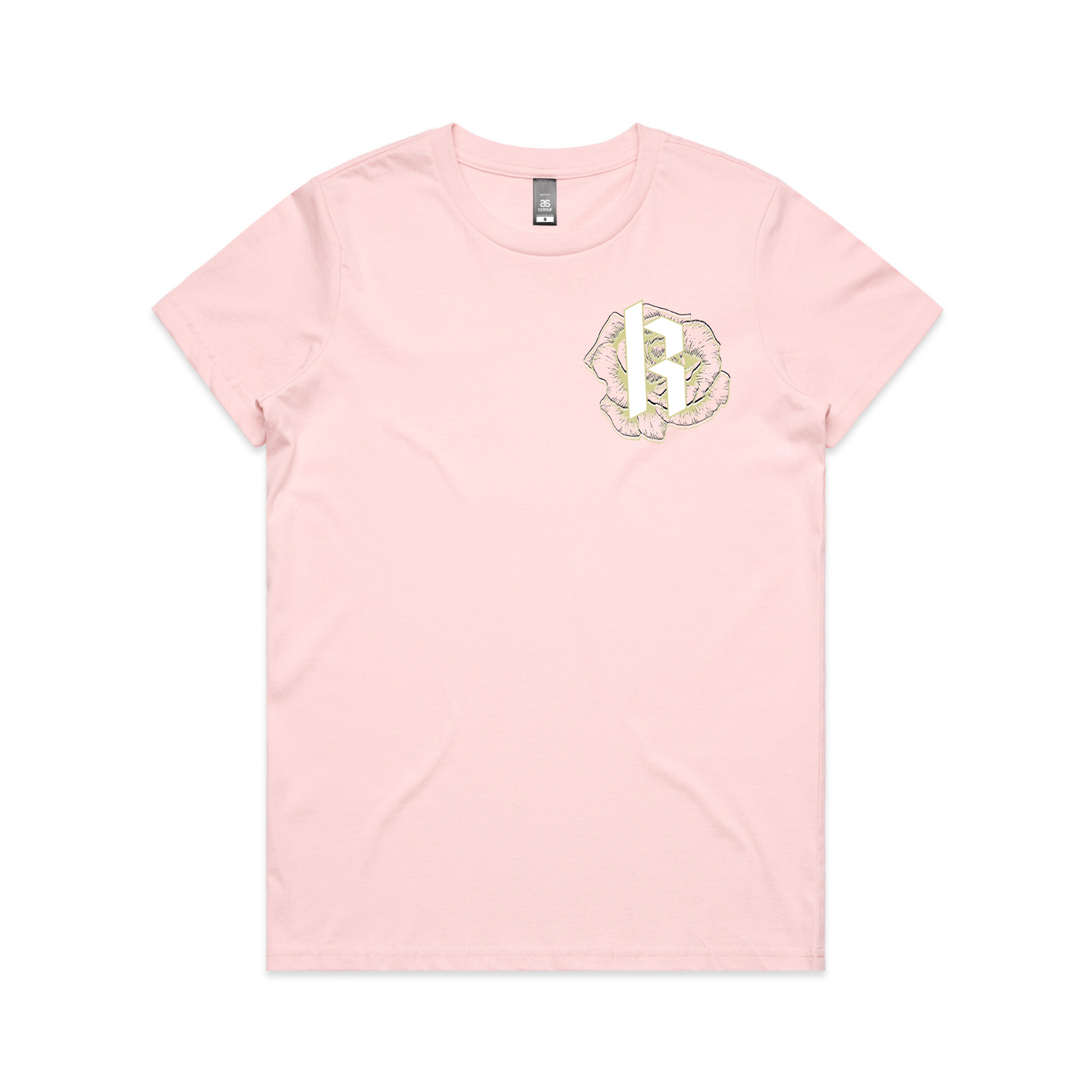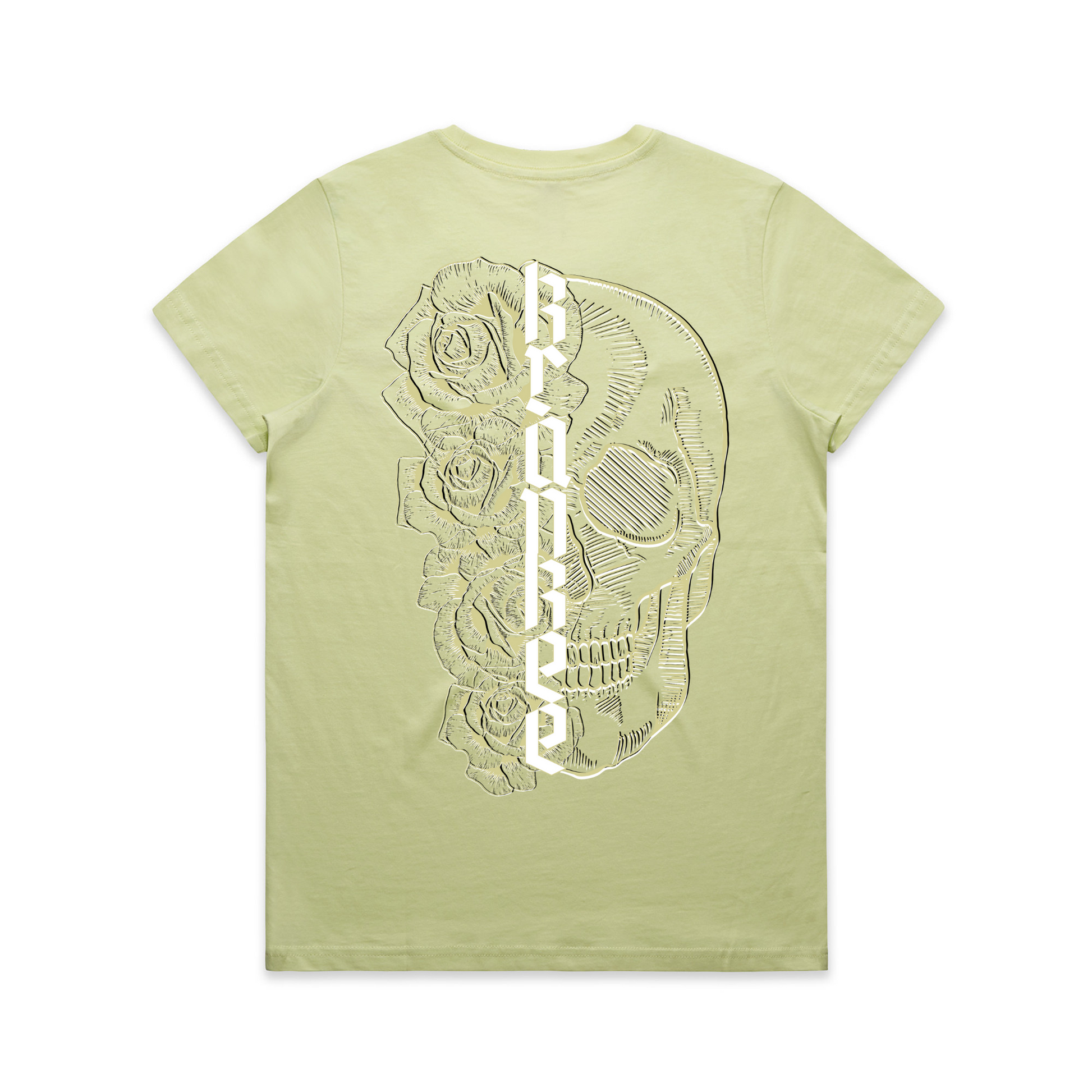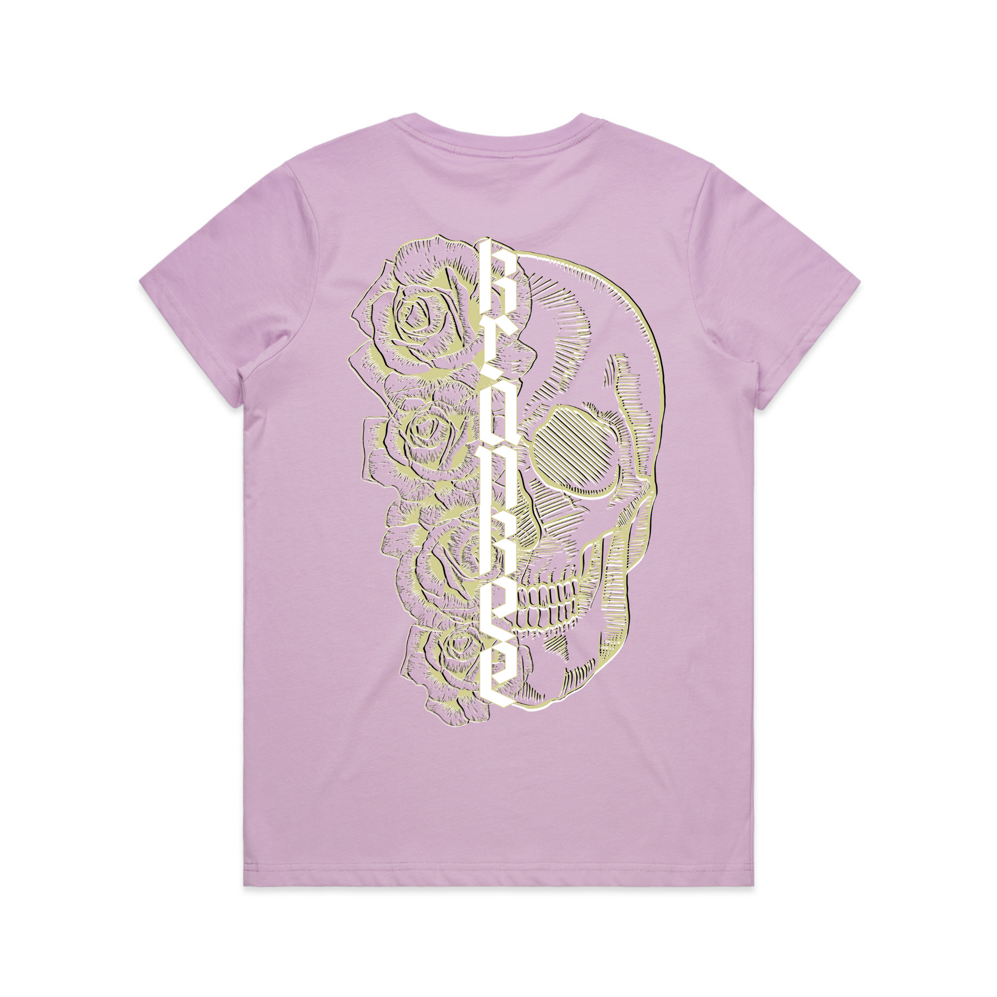 Large metallic rose/skull back piece. Small Metallic K/Rose logo design on the front - the gold being metallic.