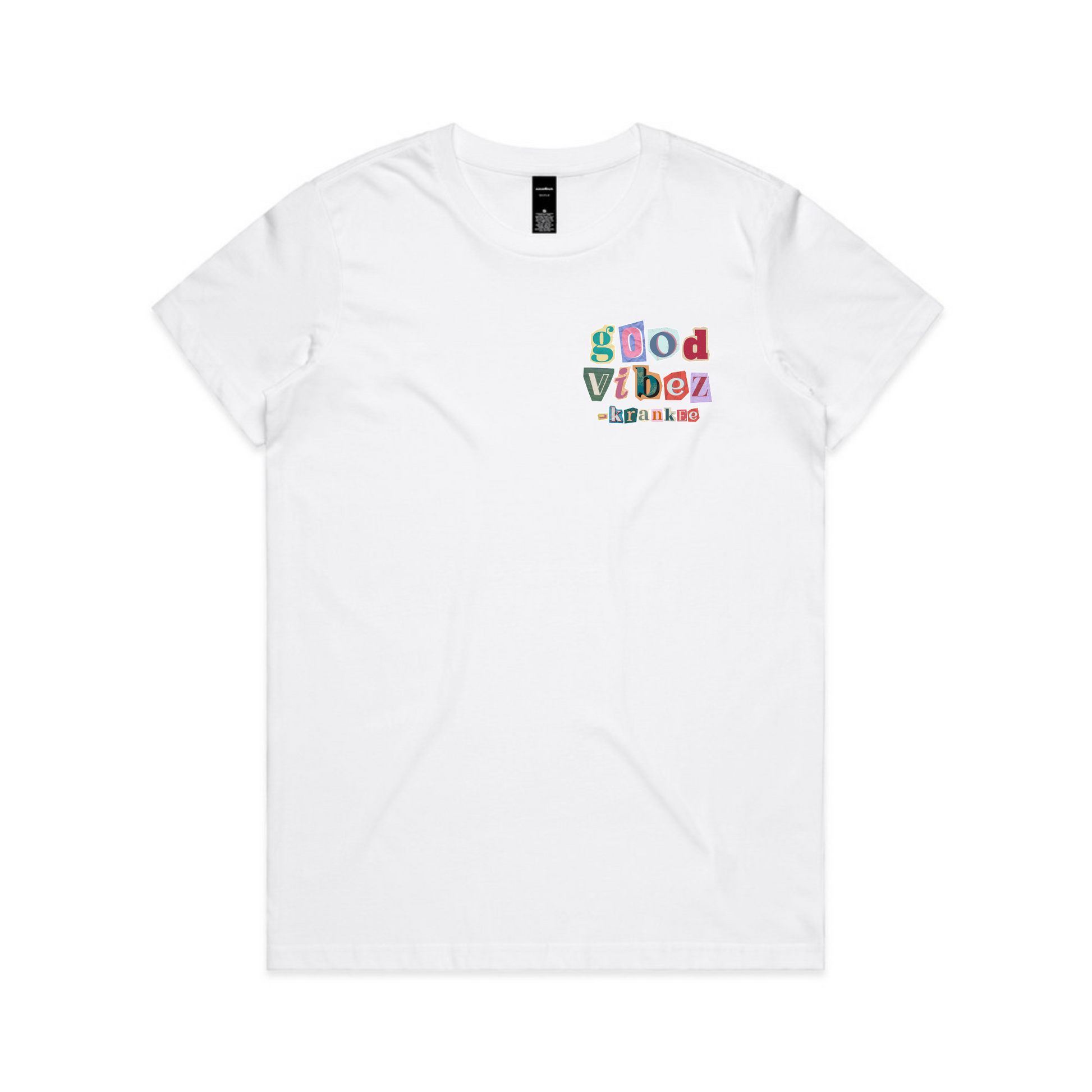 Large Krankee good vibez design on the back, mini chest one on the front.